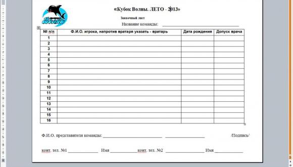 Заявочный лист для турнира "Кубок Волны. Лето 2013"