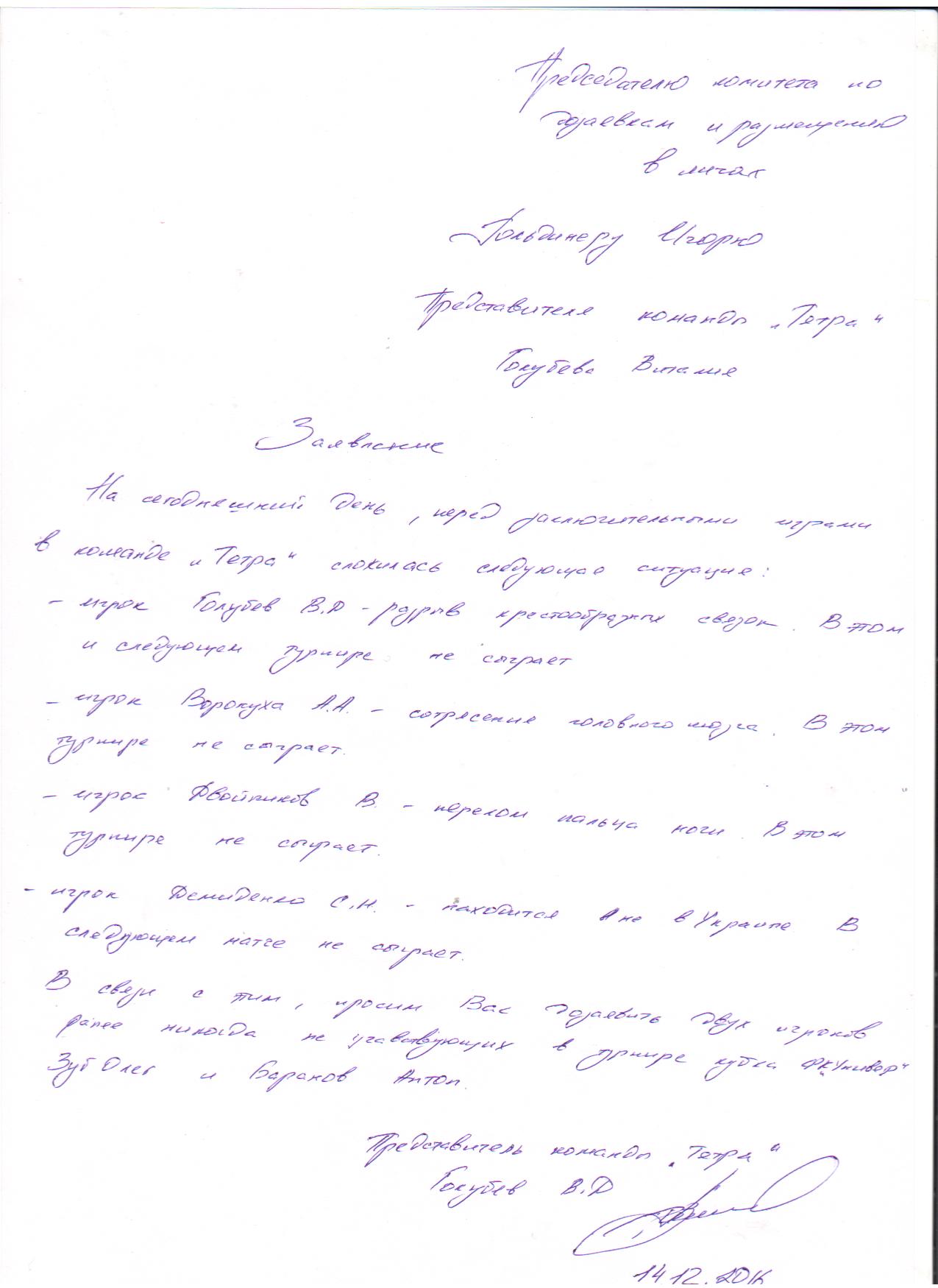 Комитет по дозаявкам рассмотрел письмо и принял решение разрешить дозаявку игроков