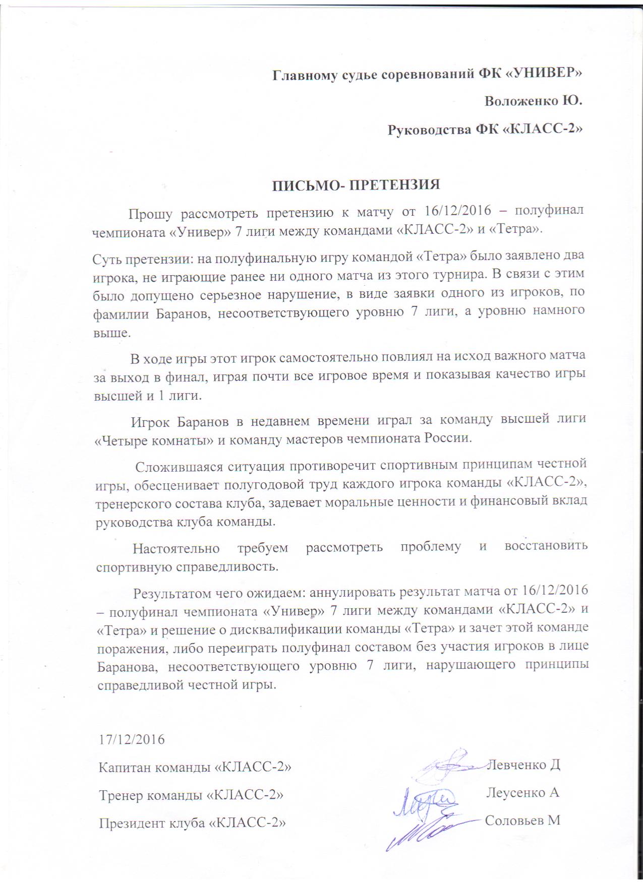 И последнее. Только лишь в связи прочтением надуманного, заведомо вводящим в заблуждение членов оргкомитета, письма-претензии, считаю абсолютно обоснованным указать на вопиющий факт несоблюдения регламента. Тренер команды Класс-2 Леусенко А. должен отбывать дисквалификацию 7 матчей и не имел права находится на «бровке», что бы руководить действиями команды. Согласно регламенту команде должно быть присуждено техническое поражение. Данный факт все игроки нашей команды знали, но никогда бы не использовали его против команды «Класс-2», ни при каком бы то ни было исходе матча, если бы не подобные заявления ее руководства.